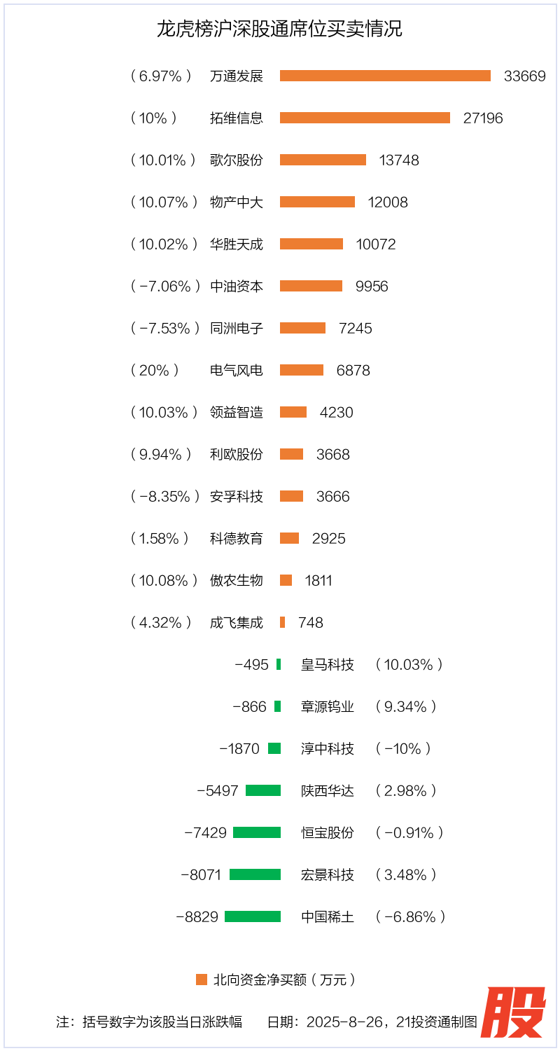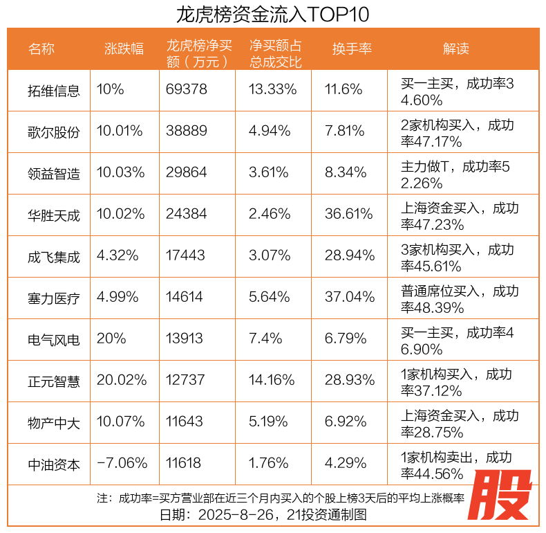 8月26日,上证指数下跌0.39%,深证成指上涨0.26%,创业板指下跌0.75%。盘后龙虎榜数据显示,共有54只个股因当日异动登上龙虎榜,资金净流入最多的是拓维信息(002261.SZ),达6.94亿元。