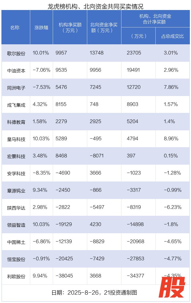 值得注意的是,机构和北向资金共同净买入了歌尔股份、中油资本、同洲电子、科德教育、成飞集成;共同净卖出了章源钨业、陕西华达、恒宝股份、中国稀土;在领益智造,利欧股份,安孚科技,皇马科技,宏景科技上出现分歧,机构净卖出领益智造1.91亿元,北向资金净买入4230.14万元;机构净卖出利欧股份3.8亿元,北向资金净买入3668.23万元;机构净卖出安孚科技4689.7万元,北向资金净买入3666.22万元;机构净买入皇马科技5288.52万元,北向资金净卖出494.64万元;机构净买入宏景科技8468.32万元,北向资金净卖出8071.47万元。