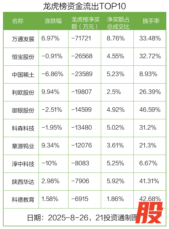 而龙虎榜中资金净流出最多的是万通发展(600246.SH),被净卖出为7.17亿元,占总成交金额的8.76%。万通发展收盘上涨6.97%,换手率为33.48%。