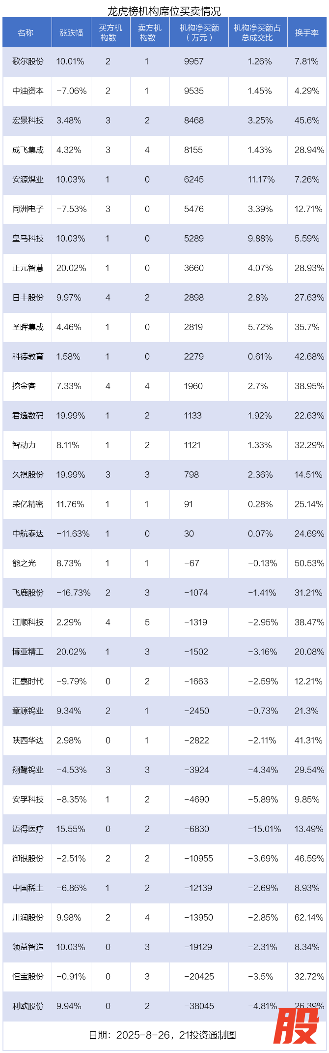 8月26日,33只个股龙虎榜出现了机构的身影,机构合计净卖出7.11亿元。具体来看,机构净买入17股,净卖出16股。